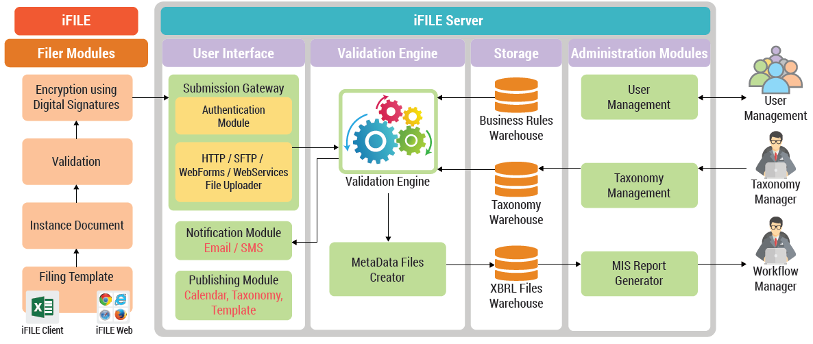 IRIS iFILE is divided into filer and regulator modules. The filer modules allow filers to create XBRL instance documents for filing a disclosure with the regulator. The regulator modules consist of several applications that allow the regulator to accept, validate and store instance documents.